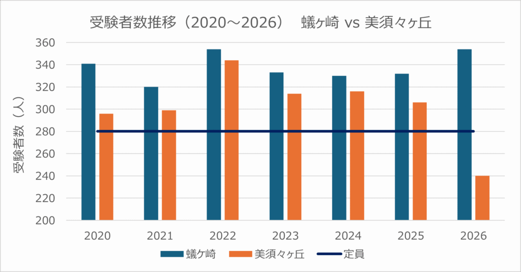 ここで、蟻ヶ崎の「73人不合格」という数字に戻りたい。 まずは、この背景にある受験者数の推移を確認しておきたい。 下のグラフを見ると、両校はこれまで一定の差を保ちながら推移してきたが、今年はその関係が大きく崩れていることがわかる。